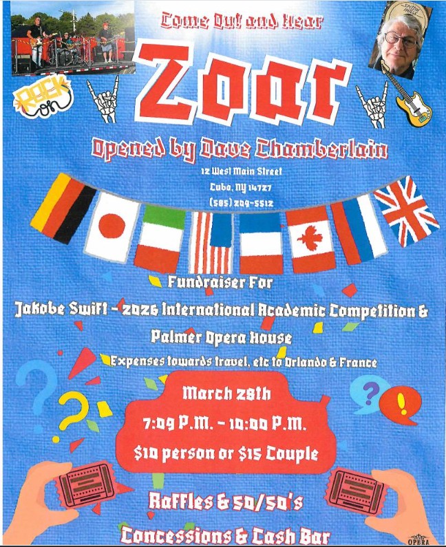A community fundraiser will be held on March 28 from 7–10 p.m. at the Palmer Opera House in Cuba, New York to support Cuba-Rushford eighth grader Jakobe Swift as he prepares to compete in the International Academic Competitions History Bee National Championship this May in Orlando, Florida.