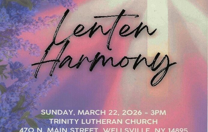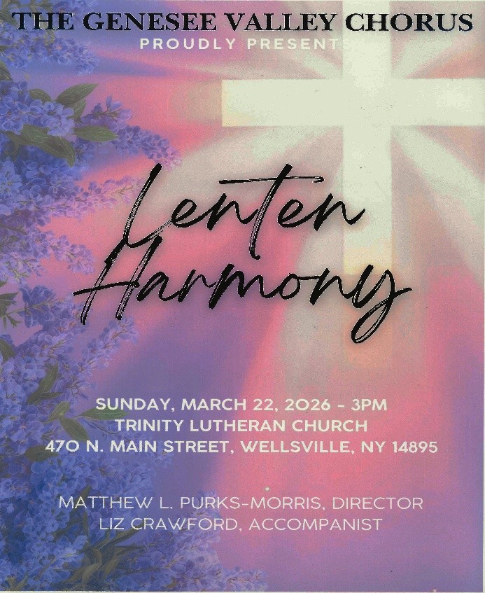 Despite some lingering pain from my ditch encounter a couple of weeks ago, my pain was completely absent as I sang with the Genesee Valley Chorus in our “dress rehearsal” at Trinity Lutheran Church in Wellsville last night. This Lenten season concert, directed by Matthew L. Purks-Morris and accompanied by Liz Crawford on Piano, will be presented this coming Sunday at 3:00 PM.