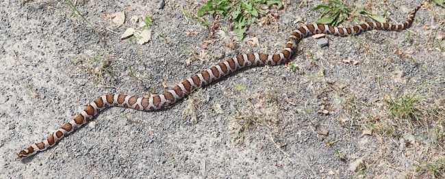 They are called milk snakes because a long held myth said that they frequented barns because they sucked cows’ teats at night when no one was looking. We all know now that’s silly – snakes don’t drink milk and they don’t have sucking mouth parts. We do know that they thrive at farms by hiding in hay piles and under structures, where they can feast on the mice and rats that are common to feedlots. Even if you don’t live on a farm, the snakes’ affinity for barns and dark places might have them living in your garage or shed.