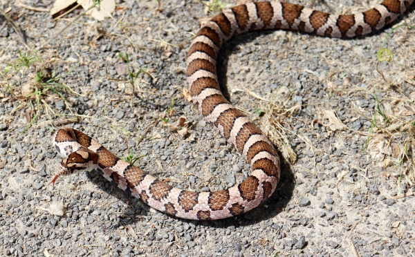 Milk snakes do have, to the uninitiated, a copperhead-like appearance. Copperheads have brown bands contrasting a lighter brown base. Adult milk snakes have brown blotches (versus bands) on a lighter base, but their base tends to be more steely grey. Young milk snakes will sport reddish-chestnut blotches on a brighter, silvery, almost white background. Also, the heads of copperheads are unmarked, while milk snakes sports blotches and a tell-tale “v” at the top of the neck.