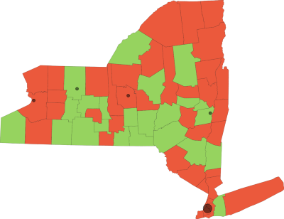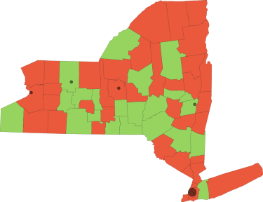 From NYFocus.com, by Melissa Manno, image key- red counties are closed, green counties are still open