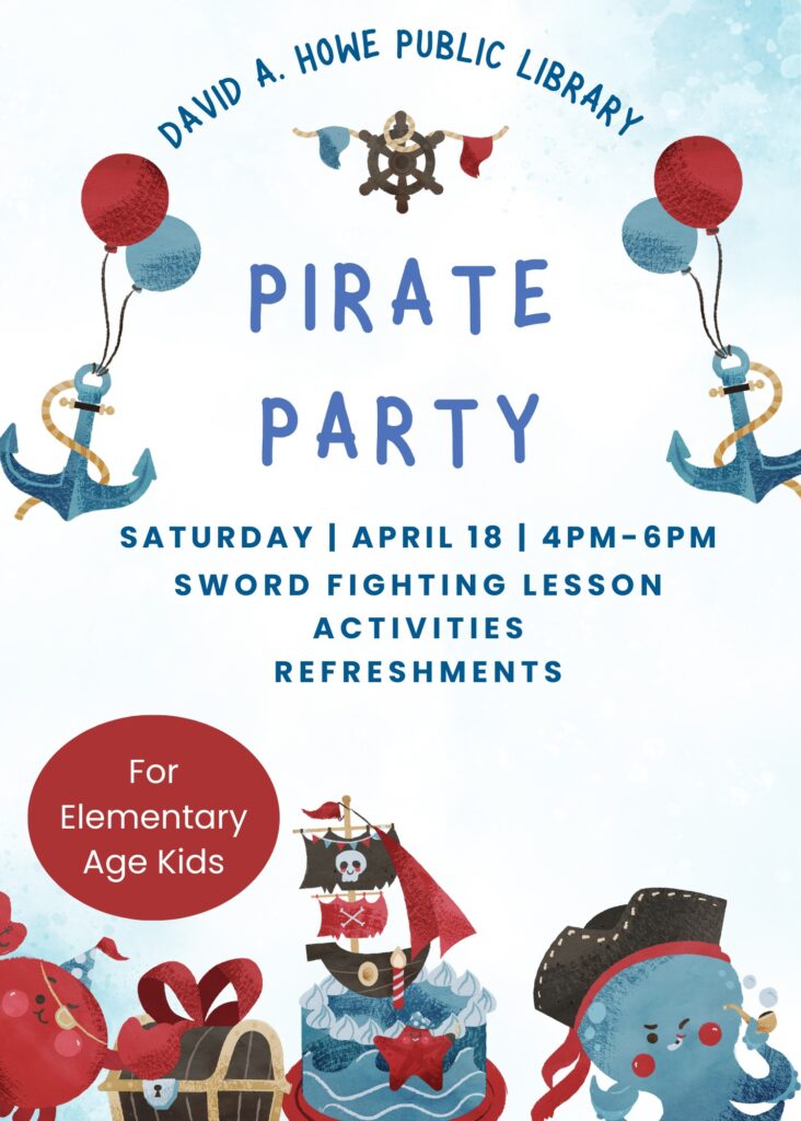 The David A. Howe Public Library invites all elementary school age lads and lassies to embark on a swashbuckling Pirate Party on Saturday, April 18, from 4:00 PM to 6:00 PM.