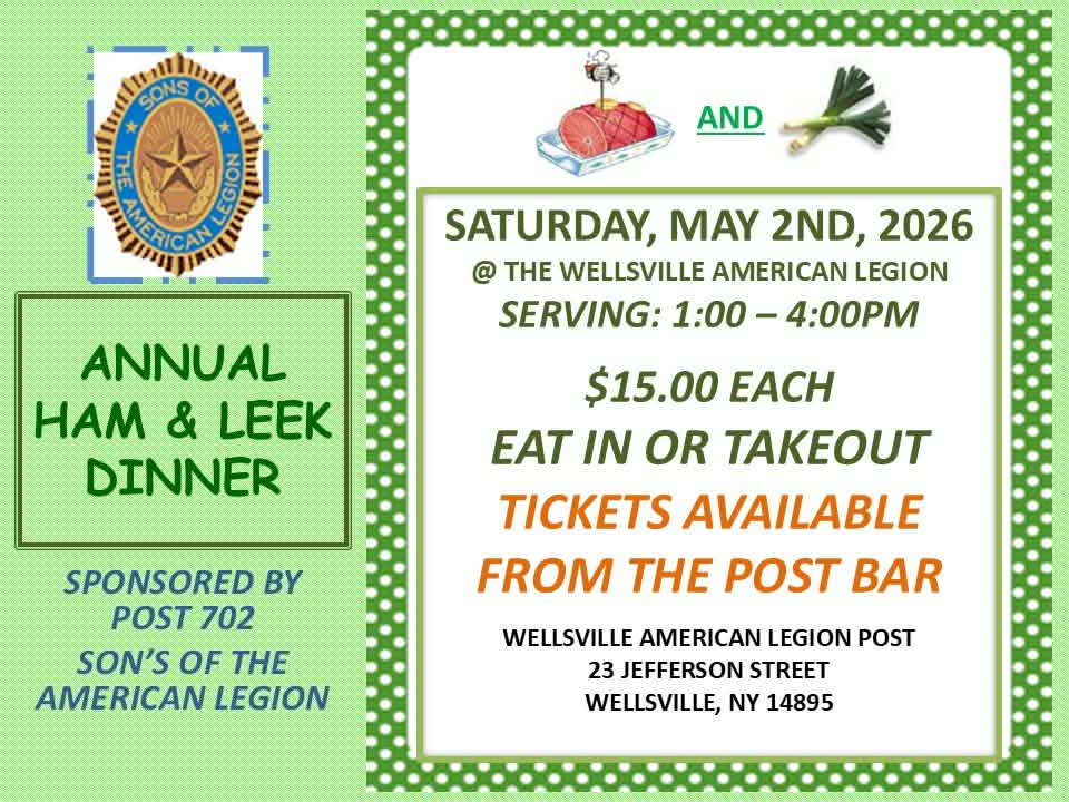 Come to the Wellsville American Legion on Jefferson Street starting at 1pm, grab a drink and dig in! Meal service will be until 4pm but don’t delay, when the leeks are gone this event won’t be back until next year!