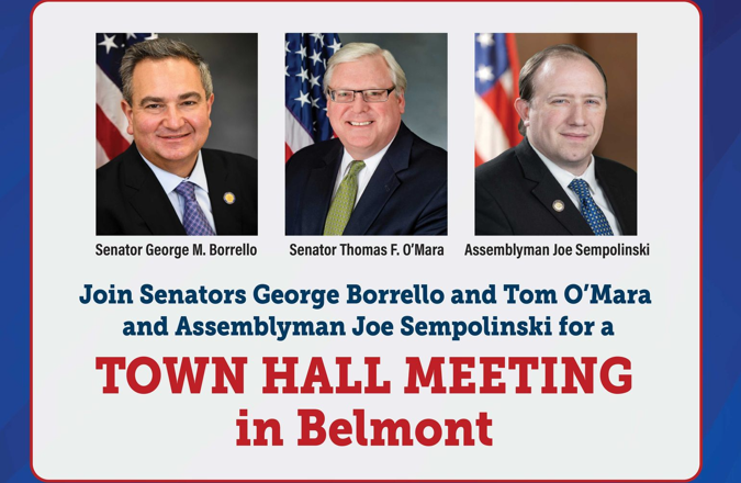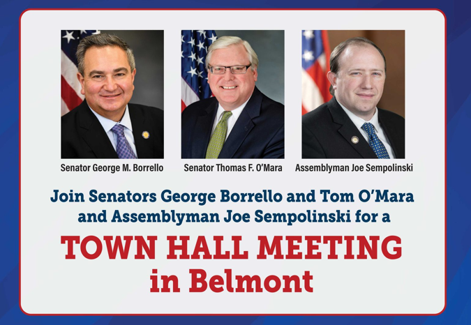 BELMONT – State Senators George Borrello (R,C – 57th Senate District), Tom O’Mara (R,C – 58th Senate District) and Assemblyman Joe Sempolinski (R,C- 148th Assembly District) will hold a joint Town Hall meeting Thursday, April 23, from 6 to 7 p.m. at Genesee Valley Central School in Belmont.