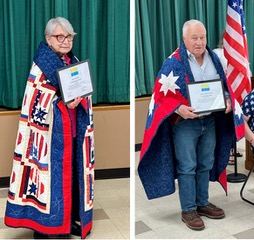 Presented a quilt hand pieced and bound by one of the chapter members and quilted by a Quilt of Valor volunteer were Kay Klein from Angelica and Bob Barber from Belfast. Both served during the Vietnam era: Mrs. Klein with the US Air Force in a military hospital in the Philippines, and Mr. Barber with the US Army stationed in South Vietnam.
