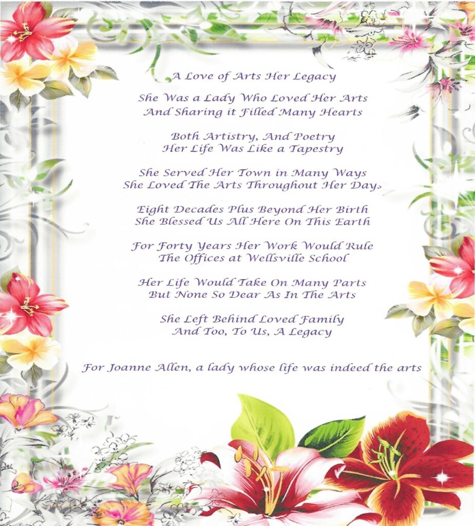 I will leave you now with a poem that I wrote honoring our local “patroness of the arts” JoAnne Allen. May she rest in peace and know that she was mentioned last night and is still in the hearts of many still upon the grassy side of this earth. We are grateful for her efforts and love of the arts.