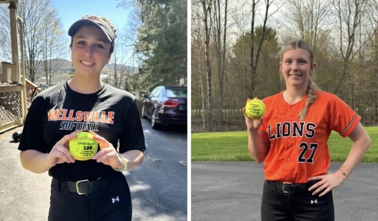 (Photo: In the span of a week, Wellsville pitchers Brynn Hallock, left, and Kennedy Perry picked up their 100th career strikeouts)